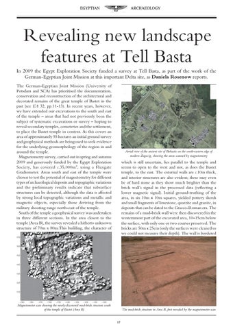 Revealing new landscape features at Tell Basta In 2009 the Egypt Exploration Society funded a survey at Tell Basta, as part of the work of the German-Egyptian Joint Mission at this important Delta site, as Daniela Rosenow reports. The German-Egyptian Joint Mission (University of Potsdam and SCA) has prioritised the documentation, conservation and reconstruction of the architectural and decorated remains of the great temple of Bastet in the past (see EA 32, pp.11-13). In recent years, however, we have extended our excavations to the south and east of the temple – areas that had not previously been the subject of systematic excavations or survey – hoping to reveal secondary temples, cemeteries and the settlement, to place the Bastet temple in context. As this covers an area of approximately 55 hectares an initial ground survey and geophysical methods are being used to seek evidence for the underlying geomorphology of the region in and around the temple. Magnetometry survey, carried out in spring and autumn 2009 and generously funded by the Egypt Exploration Society, has covered c.35,000m 2, using a Fluxgate Gradiometer. Areas south and east of the temple were chosen to test the potential of magnetometry for different types of archaeological deposits and topographic variations and the preliminary results indicate that subsurface structures can be detected, although the data is affected by strong local topographic variations and metallic and magnetic objects, especially those deriving from the military shooting range north-east of the temple. South of the temple a geophysical survey was undertaken in three different sections. In the area closest to the temple (Area B), the survey revealed a hitherto unknown structure of 70m x 80m.This building, the character of