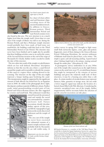 by a layer of clean yellow sand and limestone chips: revealing traces of the ancient foundation trench. In addition to GraecoRoman pottery, Third Intermediate Period and Late Period ceramics were also found in this area. The new structure is on a much higher level than the temple itself. Given that it is not clear if the temple of Bastet was still in use during the Roman Period, and that a Ptolemaic temple structure would probably have been made of hard stone not mud-bricks, the building could date back to the Third Intermediate Period or Late Period. The structure may never have been finished and it might also be possible that these building activities came to an end in the course of the Second Persian invasion at the end of the reign of Nectanebo II. Clearly, further work is needed to clarify the date of this structure. The two other sites south of the temple revealed features which are less well defined. Herodotus’ description informs us that this was the area where a canal flowed around the temple and it is possible to identify the remains of this canal in a region where nothing showed in the scanning. The structure on the edge of this area might represent a barque landing quay bordering the canal. This interpretation might be supported by the significant amount of dark alluvial clay found here by an Egyptian team in 2008. As visible in the photograph above right, this deposit combines material of different colours. Further south, initial ground-truthing revealed parts of Late Period and Graeco-Roman houses; the date suggested by ceramics and small finds. This settlement would thus extend beyond the presumed canal and outside the sacred area surrounded by a massive enclosure wall. Future excavations should elucidate further aspects of this area, and fill the topographical gap between the newly discovered settlement and the temple of Bastet. The area east of the temple has never been excavated but substantial remains of a massive temple enclosure wall, probably built by Nectanebo II, are still visible today. A