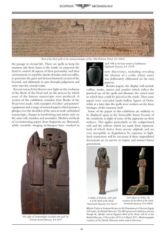 new discoveries, including revealing the identity of a scribe whose name was deliberately obliterated on his own papyrus. Besides papyri, the display will include coffins, masks, statues and amulets which reflect the practical use of the spells and illustrate the varied ways in which they could be placed in the tomb. Thus some papyri were concealed inside hollow figures of Osiris, while at a later date the spells were written on the linen bandages of the mummy itself. Some of the papyri in this exhibition are unlikely to be displayed again in the foreseeable future because of the sensitivity to light of some of the pigments on their surfaces. This applies particularly to the realgar-based reds and the yellows which are made from orpiment, both of which derive from arsenic sulphide and are very susceptible to degradation by exposure to light. Such restrictions will be necessary if these unparalleled documents are to survive to inspire and instruct future generations.