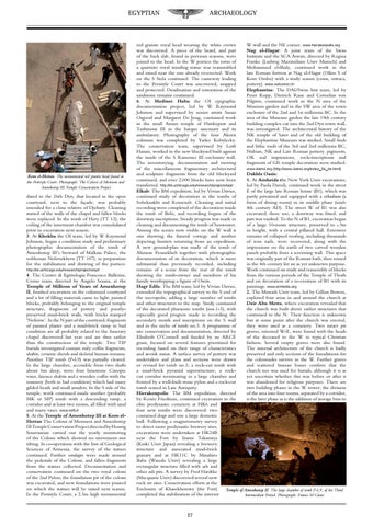 4. The Centro di Egittologia Francesco Ballerini, Como team, directed by Angelo Sesana, at the Temple of Millions of Years of Amenhotep II, finished excavation in the columned courtyard and a lot of filling materials came to light: painted blocks, probably belonging to the original temple structure, fragments of pottery and poorlypreserved mud-brick walls, with bricks stamped ‘Neferiw’. In the N part of the courtyard, fragments of painted plaster and a mud-brick ramp in bad condition are all probably related to the funerary chapel discovered last year and are thus earlier than the construction of the temple. Two TIP burials investigated contain only coffin fragments, shabtis, ceramic sherds and skeletal human remains. Another TIP tomb (P-L9) was partially cleared. In the large chamber, accessible from two shafts about 6m deep, were four limestone Canopic vases, faience shabtis and a wooden coffin with the mummy (both in bad condition) which had many gilded beads and small amulets. In the S side of the temple, work continued inside another (probably MK or SIP) tomb with a descending ramp, a corridor and at least two rooms, all filled with sand and many vases. www.cefb.it 5. At the Temple of Amenhotep III at Kom elHettan The Colossi of Memnon and Amenhotep III Temple Conservation Project directed by Hourig Sourouzian carried out the yearly monitoring of the Colossi which showed no movement nor tilting. In co-operation with the Inst of Geological Sciences of Armenia, the survey of the statues continued. Further sondages were made around the pedestals of the Colossi, and fallen fragments from the statues collected. Documentation and conservation continued on the two royal colossi of the 2nd Pylon; the foundation pit of the colossi was excavated, and new foundations were poured on which the statues will be raised next season. In the Peristyle Court, a 2.5m high monumental