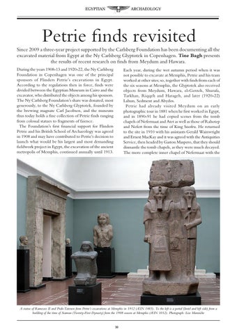 Petrie finds revisited Since 2009 a three-year project supported by the Carlsberg Foundation has been documenting all the excavated material from Egypt at the Ny Carlsberg Glyptotek in Copenhagen. Tine Bagh presents the results of recent research on finds from Meydum and Hawara. During the years 1908-13 and 1920-22, the Ny Carlsberg Foundation in Copenhagen was one of the principal sponsors of Flinders Petrie’s excavations in Egypt. According to the regulations then in force, finds were divided between the Egyptian Museum in Cairo and the excavator, who distributed the objects among his sponsors. The Ny Carlsberg Foundation’s share was donated, most generously, to the Ny Carlsberg Glyptotek, founded by the brewing magnate Carl Jacobsen, and the museum thus today holds a fine collection of Petrie finds ranging from colossal statues to fragments of faience. The Foundation’s first financial support for Flinders Petrie and his British School of Archaeology was agreed in 1908 and may have contributed to Petrie’s decision to launch what would be his largest and most demanding fieldwork project in Egypt, the excavation of the ancient metropolis of Memphis, continued annually until 1913.