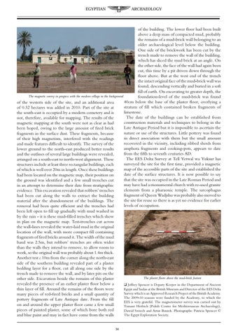 of the building. The lower floor had been built above a deep mass of compacted mud, probably the remains of a mud-brick wall belonging to an older archaeological level below the building. One side of the brickwork has been cut by the trench made to remove the wall of the building, which has sliced the mud brick at an angle. On the other side, the face of the wall had again been cut, this time by a pit driven down through the floor above. But at the west end of the trench the intact original face of the mud-brick wall was found, descending vertically and buried in a soft fill of earth. On excavating to greater depth, the The magnetic survey in progress with the modern village in the background foundation-level of the mud-brick was found 40cm below the base of the plaster floor, overlying a of the western side of the site, and an additional area stratum of fill which contained broken fragments of of 0.32 hectares was added in 2010. Part of the site at limestone. the south-east is occupied by a modern cemetery and is The date of the buildings can be established from not, therefore, available for mapping. The results of the construction materials and techniques to belong in the magnetic mapping at the south were not as clear as had Late Antique Period but it is impossible to ascertain the been hoped, owing to the large amount of fired brick nature or use of the structures. Little pottery was found fragments in the surface dust. These fragments, because in direct association with them but the small amount of their high magnetism, interfered with the readings recovered in the vicinity, including ribbed sherds from and made features difficult to identify. The survey of the amphora fragments and cooking-pots, appears to date lower ground to the north-east produced better results from the fifth to seventh centuries AD. and the outlines of several large buildings were revealed, The EES Delta Survey at Tell Yetwal wa Yuksur has arranged on a south-east to north-west alignment. These surveyed the site for the first time, provided a magnetic structures include at least three rectangular buildings, each map of the accessible parts of the site and established the of which is well over 20m in length. Once these buildings date of the surface structures. It is now possible to say had been located on the magnetic map, their position on that the site was occupied in the Late Roman Period and the ground was identified and a few small trenches cut may have had a monumental church with re-used granite in an attempt to determine their date from stratigraphic elements from a pharaonic temple. The sarcophagus evidence. This excavation revealed that robbers’ trenches fragment of Queen Wadjshu was probably also moved to had been cut along the walls to extract the building the site for reuse so there is as yet no evidence for earlier material after the abandonment of the buildings. The levels of occupation. removal had been quite efficient and the trenches had been left open to fill up gradually with mud washed in by the rain - it is these mud-filled trenches which show in plan on the magnetic map. Test-trenches cut across the wall-lines revealed the water-laid mud in the original location of the wall, with more compact fill containing fragments of fired bricks around it. The width of the mud band was 2.5m, but robbers’ trenches are often wider than the walls they intend to remove, to allow room to work, so the original wall was probably about 1.4m thick. Another test c.10m from the corner along the north-east side of the southern building revealed part of a plaster bedding layer for a floor, cut all along one side by the trench made to remove the wall, and by later pits on the The plaster floors above the mud-brick feature other side. Excavation beside the remains of this plaster revealed the presence of an earlier plaster floor below a q Jeffrey Spencer is Deputy Keeper in the Department of Ancient Egypt and Sudan at the British Museum and Director of the EES Delta thin layer of fill. Around the remains of the floors were Survey which is an Approved Research Project of the British Academy. many pieces of red-fired bricks and a small quantity of The 2009-10 seasons were funded by the Academy, to which the pottery fragments of Late Antique date. From the fill EES is very grateful. The magnetometer survey was carried out by on and around the upper plaster floor came a few small Tomasz Herbich (Polish Centre for Mediterranean Archaeology), pieces of painted plaster, some of which bore both red Dawid Swiech and Artur Buszek. Photographs: Patricia Spencer Š The Egypt Exploration Society. and blue paint and may in fact have come from the walls 34