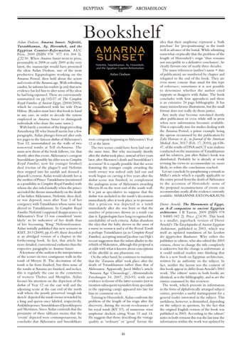 idea that their amphorae represent a ‘bulk purchase’ for ‘pre-positioning’ in the tomb well in advance of the burial. While admitting somewhat cryptically that the problem of the Nefertiti, Tutankhamun, Ay, Horemheb andlength the Egyptian Counter-Reformation of Horemheb’s reign ‘thus remains nothissusceptible to a definitive conclusion’, he new study, drawing on the latest research, tells the story of the clearly favours one of nearly three decades. decline and fall of the pharaoh Akhenaten’s religious revolution in the The many references (author’s name + date . Beginning at the fourteenth century regime’s high-point in his Year 12, it traces of publication) are numbered by chapter and the subsequent collapse that saw the deaths of many of the king’s loved ones, relegated to the end of the book. They are his attempts to guarantee the revolution through co-rulers, and the last frenzied even more concise than usual for this type assault on the god Amun. The book then outlines the events of of reference; sometimes it is not possible the subsequent five decades that saw the extinction of the royal line, an attempt to to determine whether the author cited place a foreigner on Egypt’s throne, and thesupports accession of three army in turn. orofficers disagrees with Aidan. The book Among its conclusions are that the mother of Tutankhamun was none with other than four appendices and there concludes Nefertiti, and that the queen was jointis an 24 page bibliography. It has pharaoh in turnextensive with both her husband Akhenaten and her son. As such, she was many monochrome illustrations, but the small herself instrumental in beginning the return to orthodoxy, undoing her erstformat doesbeforenot really do them justice. while husband’s life-work her own mysterious disappearance. Any study may become out-dated shortly after publication or even while still in press when new information becomes available. This is especially true for studies dealing with the Amarna Period, a prime example being the uproar occasioned by the publication by Zahi Hawass et al., in Journal of the American Medical Assn. 303:7 (Feb. 17, 2010), pp.63847, of the results of DNA and CT scan analyses conducted on the mummies of Tutankhamun and his relatives, just after Aidan’s book was distributed. Probably he is already at work revising his views to accommodate or, more likely, to refute the conclusions reached. Let me conclude by paraphrasing a remark in Miller’s article which is equally applicable to the entire period from the death of Akhenaten to the accession of Horemheb: none of the proposed reconstructions of events can accommodate neatly all the evidence currently available. MARIANNE EATON-KRAUSS