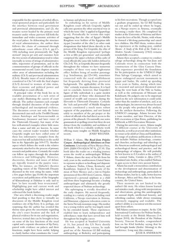 in human and physical terms. In embarking on his survey of Middle Kingdom court officials Grajetzki rightly calls into question the often uncritical way in which the term ‘elite’ is applied in Egyptology (p.vii). Periodically he revisits this topic suggesting that the elite of Egypt’s Middle Kingdom were holders of the Egyptian title iry-pat (‘member of the elite’) or other rank designations that linked them directly to the person of the king. For Grajetzki, the elite of the Middle Kingdom represented ‘perhaps as few as fifty per generation’ and essentially comprised the upper echelons of this cadre of royal officials (the same title holders defined in Chs.2-4). Yet, as Grajetzki discusses frequently throughout the volume we have numerous examples of these very same high-status office holders being of modest parentage (e.g: Senebsumay, pp.125-140), sometimes connected with the royal establishment but frequently deriving from provincial backgrounds. The applicability of the term ‘elite’ certainly warrants discussion. It is hard not to conclude, however, that Grajetzki’s figure of fifty individuals is a quite modest quantification of those who dominated the control of wealth and resources during the Eleventh to Thirteenth Dynasties. Certainly the ‘rich and powerful’ of Middle Kingdom society constituted a much more robust segment of the population, and not limited solely to members of the pat proper or the cohort of officials who had direct access to the person of the pharaoh. Occasionally one notes grammatical or spelling errors but these do not detract from the readability and usefulness of the book which is a valuable synthetic work offering many insights on Middle Kingdom society. JOSEF WEGNER William Y Adams, The Road from Frijoles Canyon. Anthropological Adventures on Four Continents. University of New Mexico Press, 2009. (ISBN 978 0 82634 787 9). £37.95. This book takes the reader on a winding journey across the world as anthropologist William Y Adams, shares the story of his life from his early years in the southwestern United States to sojourns in places as far-flung and disparate as Sudanese Nubia, China, Kentucky and Kazakhstan. Inspired by the beauty of the mesas of New Mexico and a visit to Frijoles (pronounced free-HO-lees) Canyon, Adams experienced a personal epiphany as a child and from these beginnings became a leading anthropologist and ultimately the greatly respected doyen of Nubian archaeology. His upbringing is vividly described in the early chapters. He moved frequently, residing in a variety of places including rural California, a Navajo reservation in Arizona, and Manzanar, a Japanese relocation centre in the Sierra Nevada mountain range. His mother was a young widow and he was largely raised by his extended family. These experiences enabled him to learn independence and self-reliance; traits that have served him well throughout his lengthy career. He was accepted at Stanford University at 16, but joined the US Navy shortly afterwards. As a young veteran, he made good use of the American GI Bill studying anthropology at Berkeley and participating 37