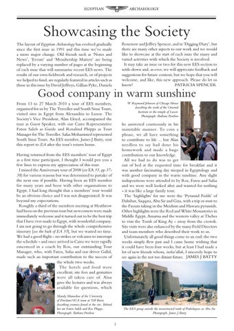he answered courteously in his inimitable manner. To coin a phrase, we all have something to contribute to life ... but Alan needless to say had done his homework and made a huge contribution to our knowledge. All we had to do was to get out of bed at the requested time for breakfast and it was another fascinating day steeped in Egyptology and with good company in the warm sunshine. Any slight indispositions were attended to by Ros, Faten and Safaa and we were well looked after and wanted for nothing - it was like a large family tour. The ‘highlights’ for me were the ‘Pyramid Fields’ of Dahshur, Saqqara, Abu Sir and Giza, with a trip en route to the Fayum taking in the Meidum and Hawara pyramids. Other highlights were the Red and White Monasteries in Middle Egypt, Amarna and the western valley at Thebes to visit the Tomb of King Ay - away from the crowds. Site visits were also enhanced by the many Field Directors and team members who described their work to us. Unfortunately all good things come to an end: the two weeks simply flew past and I came home wishing that it could have been four weeks, but at least I had made a lot of new friends whom, insha’allah, I sincerely hope to see again in the not too distant future. JAMES J BATTY