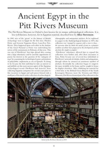 Ancient Egypt in the Pitt Rivers Museum The Pitt Rivers Museum in Oxford is best known for its unique anthropological collections. It is less well-known, however, for its Egyptian material, described here by Alice Stevenson. In 1881 two of the ‘greats’ in the history of British archaeology were in Egypt for the first time; Flinders Petrie and General Augustus Henry Lane-Fox PittRivers. They happened upon each other in the shadow of the Great Pyramid as Petrie was undertaking his survey of the monuments in February of that year. This was one of Pitt-Rivers’ first trips abroad after coming into a large inheritance and he used the opportunity to pursue his interest in the question of the ‘antiquity of man’ by examining the technological nature and position of palaeolithic implements in situ at Qurneh. In doing so he became the first individual to take an interest in and publish on this most ancient aspect of the Egyptian archaeological record. Pitt-Rivers had, however, been collecting Egyptian antiquities for several years prior to this excursion to Egypt and such pieces formed only a small part of his much wider collection of archaeological,