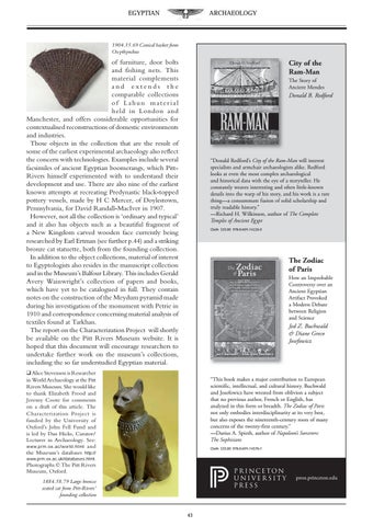 of furniture, door bolts and fishing nets. This material complements and extends the comparable collections of Lahun material held in London and Manchester, and offers considerable opportunities for contextualised reconstructions of domestic environments and industries. Those objects in the collection that are the result of some of the earliest experimental archaeology also reflect the concern with technologies. Examples include several facsimiles of ancient Egyptian boomerangs, which PittRivers himself experimented with to understand their development and use. There are also nine of the earliest known attempts at recreating Predynastic black-topped pottery vessels, made by H C Mercer, of Doylestown, Pennsylvania, for David Randall-MacIver in 1907. However, not all the collection is ‘ordinary and typical’ and it also has objects such as a beautiful fragment of a New Kingdom carved wooden face currently being researched by Earl Ertman (see further p.44) and a striking bronze cat statuette, both from the founding collection. In addition to the object collections, material of interest to Egyptologists also resides in the manuscript collection and in the Museum’s Balfour Library. This includes Gerald Avery Wainwright’s collection of papers and books, which have yet to be catalogued in full. They contain notes on the construction of the Meydum pyramid made during his investigation of the monument with Petrie in 1910 and correspondence concerning material analysis of textiles found at Tarkhan. The report on the Characterization Project will shortly be available on the Pitt Rivers Museum website. It is hoped that this document will encourage researchers to undertake further work on the museum’s collections, including the so far understudied Egyptian material.