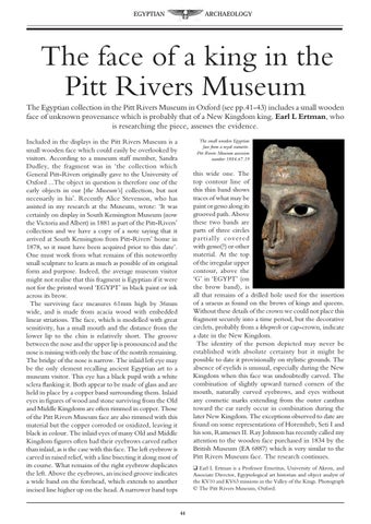 The face of a king in the Pitt Rivers Museum The Egyptian collection in the Pitt Rivers Museum in Oxford (see pp.41-43) includes a small wooden face of unknown provenance which is probably that of a New Kingdom king. Earl L Ertman, who is researching the piece, assesses the evidence. Included in the displays in the Pitt Rivers Museum is a small wooden face which could easily be overlooked by visitors. According to a museum staff member, Sandra Dudley, the fragment was in ‘the collection which General Pitt-Rivers originally gave to the University of Oxford ...The object in question is therefore one of the early objects in our [the Museum’s] collection, but not necessarily in his’. Recently Alice Stevenson, who has assisted in my research at the Museum, wrote: ‘It was certainly on display in South Kensington Museum (now the Victoria and Albert) in 1881 as part of the Pitt-Rivers’ collection and we have a copy of a note saying that it arrived at South Kensington from Pitt-Rivers’ home in 1878, so it must have been acquired prior to this date’. One must work from what remains of this noteworthy small sculpture to learn as much as possible of its original form and purpose. Indeed, the average museum visitor might not realise that this fragment is Egyptian if it were not for the printed word ‘EGYPT’ in black paint or ink across its brow. The surviving face measures 61mm high by 36mm wide, and is made from acacia wood with embedded linear striations. The face, which is modelled with great sensitivity, has a small mouth and the distance from the lower lip to the chin is relatively short. The groove between the nose and the upper lip is pronounced and the nose is missing with only the base of the nostrils remaining. The bridge of the nose is narrow. The inlaid left eye may be the only element recalling ancient Egyptian art to a museum visitor. This eye has a black pupil with a white sclera flanking it. Both appear to be made of glass and are held in place by a copper band surrounding them. Inlaid eyes in figures of wood and stone surviving from the Old and Middle Kingdoms are often rimmed in copper. Those of the Pitt Rivers Museum face are also rimmed with this material but the copper corroded or oxidized, leaving it black in colour. The inlaid eyes of many Old and Middle Kingdom figures often had their eyebrows carved rather than inlaid, as is the case with this face. The left eyebrow is carved in raised relief, with a line bisecting it along most of its course. What remains of the right eyebrow duplicates the left. Above the eyebrows, an incised groove indicates a wide band on the forehead, which extends to another incised line higher up on the head. A narrower band tops
