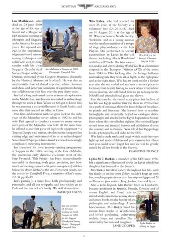 Ian Mathieson, who died on 24 June 2010 at the age of 83, was a friend and colleague of EES missions working at Memphis and Saqqara, and at Amarna, for many years. He opened our eyes to the importance of ground-based remote sensing techniques and achieved astonishing results with his own Saqqara Geophysical Ian Mathieson at Saqqara in 2006. Photograph: Campbell Price Survey Project with Jon Dittmer, sponsored by the Glasgow Museums, (formerly by the National Museum of Scotland). He was also an inexhaustible fund of shared expertise, advice, humour and ideas, and generous donations of equipment during our collaboration with him over the past thirty years. Ian had a long and varied career in mineral exploration in the Middle East, and became interested in archaeology through his work in Iran. When we first got to know him he was running a successful business in Saudi Arabia, and soon after that opened an office in Cairo. Our first collaboration with Ian goes back to the early years of the Memphis survey when in 1982 he and his wife Padi agreed to conduct a resistivity meter survey over parts of the Memphis ruin field. At the same time he offered us our first piece of high-tech equipment – a Topcon Guppy total station, obsolete to his company but cutting edge and undreamed of to us as archaeologists! Since then EES projects have shared a series of increasingly complicated surveying instruments. Ian launched his own remote-sensing programme at Saqqara in the 1980s, starting at the Gisr el-Mudir, the enormous early dynastic enclosure west of the Step Pyramid. This Project has been extraordinarily successful in showing, with great precision, just how much archaeology (much of it quite unsuspected) still lies below the desert surface at the site. For recent results, see the article by Campbell Price, a member of Ian’s team, EA 34 pp.38-39. Ian’s passing is a huge loss, both profesionally and personally, and all our sympathy and best wishes go to Padi and the rest of Ian’s family. We will all miss him. DAVID JEFFREYS