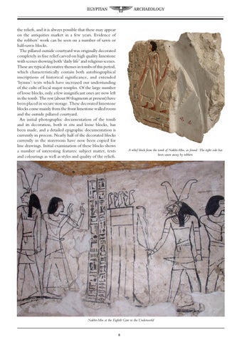 the reliefs, and it is always possible that these may appear on the antiquities market in a few years. Evidence of the robbers’ work can be seen on a number of sawn or half-sawn blocks. The pillared outside courtyard was originally decorated completely in fine relief carved on high quality limestone with scenes showing both ‘daily life’ and religious scenes. These are typical decorative themes in tombs of this period, which characteristically contain both autobiographical inscriptions of historical significance, and extended ‘hymns’: texts which have increased our understanding of the cults of local major temples. Of the large number of loose blocks, only a few insignificant ones are now left in the tomb. The rest (about 80 fragments at present) have been placed in secure storage. These decorated limestone blocks come mainly from the front limestone walled room and the outside pillared courtyard. An initial photographic documentation of the tomb and its decoration, both in situ and loose blocks, has been made, and a detailed epigraphic documentation is currently in process. Nearly half of the decorated blocks currently in the storeroom have now been copied for line drawings. Initial examination of these blocks shows a number of interesting features: subject matter, texts and colourings as well as styles and quality of the reliefs.