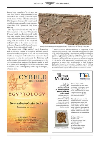 Interestingly, a number of blocks were reused from the Old Kingdom monuments situated in the vicinity of Nakht-Min’s tomb. Some of these exhibit a distinctive Old Kingdom fine raised low relief, and possibly belong to a nearby royal structure of the late Fifth Dynasty or early Sixth Dynasty. The expedition intends to carry out a full evaluation of this new Nineteenth Dynasty burial site. For the tomb itself, this may require limited clearance to define and plan the tomb, both within the living rock and outside in the courtyard and approaches to the tomb, and also an evaluation the potential for finds of objects A finely-carved Old Kingdom relief fragment which was re-used in the tomb of Nakht-Min from the destroyed original burial. The appreciation of Nakht-Min’s tomb decoration q Khaled Daoud is Associate Professor of Egyptology at the Universities of Fayum and Qatar, and is Field Director and epigrapher and architecture cannot be complete without general of the Nakht-Min expedition. His co-directors and fellow epigraphers assessment and investigation of the cliff and surrounding are Sabry Farag (SCA Chief Inspector, Saqqara) and Christopher Eyre tombs in this previously unknown cemetery. Such (Professor of Egyptology, University of Liverpool) who is also the evaluation is vital to understand the historical and expedition’s photographer. They are grateful for the help and support archaeological importance of this whole cemetery to the of Zahi Hawass, the SCA Permanent Committee and staff of the SCA Inspectorate at Saqqara. They would also like to thank the Egypt development of the Saqqara-Abu Sir necropolis, as well Exploration Society for an Excavation Fund grant and the Michela as to gather more direct political and social-historical data Schiff Giorgini Foundation, especially Nicolas Grimal and Nathalie in relation to the contemporary capital city of Memphis, Beaux-Grimal, for support of the expedition over several seasons. which it faces.