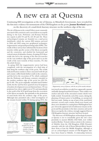 A new era at Quesna Continuing EES investigations at the site of Quesna, in Minufiyeh Governorate, have revealed for the first time evidence for monuments of the Old Kingdom on the gezira. Joanne Rowland reports on the discovery of a mud-brick funerary structure on the northern edge of the site. The site of Quesna in the central Delta is most commonly associated with cemeteries and a sacred falcon necropolis dating to the Late, Ptolemaic and Roman Periods (see reports in JEA 94 and 96, EA 28 and 32). These archaeological remains are founded on a sand gezira (turtleback), which the current EES mission surveyed in 2006 and 2009 using two geophysical techniques; magnetometry and ground penetrating radar (GPR). The results of these surveys have informed the locations of test trenches within specific sectors of the falcon necropolis and the cemeteries, and clarified the horizontal and vertical extent of subsurface features. In spring 2010 these results also led to the opening of the first test trenches on the very northern edge of the gezira and it is on the results of the most westerly of these trenches, T5, that this article focuses. In spring 2009 the magnetometry survey had been completed, with the investigation of a final strip of land along the northern edge of the gezira. The results indicated features similar to those associated with the pit and ceramic coffin burials further south in the cemetery, and this led to the excavation of T6, which confirmed that the Ptolemaic and Roman cemetery extended to the modern northern edge of the gezira (see JEA 96, pp.31-48). The gezira originally extended much further north, but the sand has been quarried away for purposes of modern development in recent historical times. T5 was positioned (see above right) west of T6 and immediately to the north of the SCA spoil heaps from the excavation of the falcon necropolis, due primarily to the protrusion of mud bricks from the northern edge of the gezira. Although time permitted only a brief investigation of the remains located within T5 during spring 2010, the