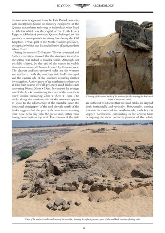 the two sites is apparent from the Late Period onwards, with inscriptions found on funerary equipment at the Quesna mausoleum referring to individuals who lived in Athribis which was the capital of the Tenth Lower Egyptian (Athribite) province. Quesna belonged to this province at some periods in history but during the Old Kingdom, it was a part of the Ninth (Busirite) province, the capital of which was located at Busiris (Djedu; modern Abusir Bana). During the summer 2010 season T5 was re-opened and further excavation showed that the structure located in the spring was indeed a mastaba tomb. Although not yet fully cleared, by the end of the season its visible dimensions measured 17m north-south by 13m east-west. The clearest and best-preserved sides are the western and northern, with the southern side badly damaged and the eastern side of the structure requiring further investigation. At the centre of the northern side there are at least four courses of well-preserved mud bricks; each measuring 50cm x 30cm x 15cm. In contrast the average size of the bricks constituting the core of the mastaba is much smaller, measuring 23cm x 15cm x 11cm. The bricks along the northern side of the structure appear to relate to the substructure of the mastaba, since the horizontal stratigraphy of the sand directly north of the bricks suggests that the part of the structure remaining must have been dug into the gezira sand, rather than having been built on top of it. The remains of this side