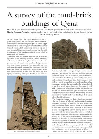 A survey of the mud-brick buildings of Qena Mud brick was the main building material used by Egyptians from antiquity until modern times. Maria Correas-Amador reports on her survey of mud-brick buildings in Qena, funded by an EES Centenary Award. At the end of 2009, the Egypt Exploration Society generously granted me a Centenary Award towards a survey of mud-brick buildings in Qena in Upper Egypt. The motivation for this project was the belief that further research was needed concerning technical aspects of mud-brick buildings, ancient and modern, together with investigation of the social and cultural aspects of life in and around the buildings. One of the main characteristics of vernacular architecture, regardless of its building materials, is the continuity of building methods throughout time, as well as the permanence of certain structural or design features that may remain unchanged for centuries or even millennia. Research suggests that this is the case for Egyptian vernacular mud-brick architecture, which now survives mainly in rural areas but which has been rapidly disappearing for the past decades, as red-brick and