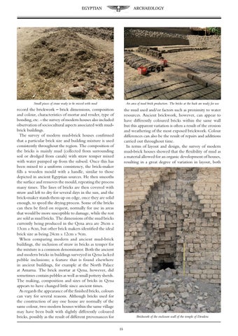 record the brickwork – brick dimensions, composition and colour, characteristics of mortar and render, type of bonding, etc. - the survey of modern houses also included observation of sociocultural aspects associated with mudbrick buildings. The survey of modern mud-brick houses confirmed that a particular brick size and building mixture is used consistently throughout the region. The composition of the bricks is mainly mud (collected from surrounding soil or dredged from canals) with straw temper mixed with water pumped up from the subsoil. Once this has been mixed to a uniform consistency, the brick-maker fills a wooden mould with a handle, similar to those depicted in ancient Egyptian sources. He then smooths the surface and removes the mould, repeating the process many times. The lines of bricks are then covered with straw and left to dry for several days in the sun, and the brick-maker stands them up on edge, once they are solid enough, to speed the drying process. Some of the bricks can then be fired on request, normally for use in areas that would be more susceptible to damage, while the rest are sold as mud bricks. The dimensions of the mud bricks currently being produced in the Qena area are 26cm x 13cm x 8cm, but other brick makers identified the ideal brick size as being 24cm x 12cm x 9cm. When comparing modern and ancient mud-brick buildings, the inclusion of straw in bricks as temper for the mixture is a common denominator. Both the ancient and modern bricks in buildings surveyed in Qena lacked pebble inclusions; a feature that is found elsewhere in ancient buildings, for example at the North Palace at Amarna. The brick mortar at Qena, however, did sometimes contain pebbles as well as small pottery sherds. The making, composition and sizes of bricks in Qena appears to have changed little since ancient times. As regards the appearance of the finished bricks, colours can vary for several reasons. Although bricks used for the construction of any one house are normally of the same colour, two modern houses within the same village may have been built with slightly differently coloured bricks, possibly as the result of different provenances for