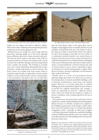 than the front façade. Stairs to the upper floor can be straight or dog-legged and are normally solid but several examples of suspended stairs were also found. In these, the steps were made of mud bricks which were placed on top of reed matting in turn laid over tree trunks, in a construction method attested in an ancient house at Amarna. Like that ancient house, these stairs featured a cupboard underneath. In an exceptional house (belonging to the mayor of Dendera) the stairs had wooden treads as well as a wooden balustrade. A feature found in the wall of several staircases was an alcove, reportedly to place an oil lamp to be used for going upstairs at night. Other alcoves or niches, serving as cupboards, are also found in other walls of the houses. Finally, there is a series of non-technical factors affecting design that needs to be taken into account in the interpretation of ancient mud-brick buildings, such as financial considerations, social status and cultural aspects. However, it is worth noting that, in modern buldings, practical considerations appear in many instances to prevail over cultural requirements. For example, a room can reportedly be used for a different activity if the usual room fitted for that purpose is subject to adverse conditions, such as being exposed to the sun in the summer. This initial survey has shown that mud brick has been regarded as a sturdy, reliable building material throughout history because it is flexible enough to be adapted to the building requirements of the people, which reflect their social and cultural needs. It is hoped that further comparative work – especially in other areas of Egypt – will help to determine whether the mud-brick buildings in Qena of different periods have more in common with each other than they do with buildings of the same periods located in other areas. q Maria Correas-Amador is a PhD research student at the University of Durham. She is grateful to the Egypt Exploration Society for funding her survey and would like to thank Ayman Wahby, Ayman Hendy (SCA inspector in Qena) and the people of the Qena region – in particular at Dendera – for their kind help and assistance during this project. Photographs by the writer.
