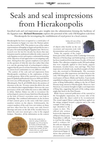 of objects relies heavily on the care excavators and museums took with documentation and record keeping. Today, the majority of the corpus forms part of the collection of the Cambridge University Museum of Archaeology and Anthropology, to which it has been transferred from the former Faculty of Oriental Studies. The collection comprises nearly 350 mud sealings that were originally applied to door knobs, papyrus documents, wooden boxes, vases and bags. They bear impressions of cylinder seals, inscribed examples of which were also excavated at Hierakonpolis. The excavators published some fifty impressions and dated them to the early Old Kingdom because the corpus included the royal names of Djoser, Khaba and Sneferu. A previously unpublished sealing seems to be inscribed with the Horus name of King Sekhemkhet, adding to the list of Third Dynasty kings attested at Hierakonpolis. However, later American excavations brought to light a seal impression of King Qaa, suggesting that parts of the sealing corpus might date back to the First Dynasty. While Green restricted publication of the material to the hieroglyphic impressions, the reverse sides of the sealings allow the object sealed to be reconstructed. The round topped Djoser sealing had been applied on the strings wrapped around a papyrus and is the only example of this sealing type identified in the corpus to date. The official title written between the impression of Djoser’s Horus name Netjerikhet is difficult Papyrus roll sealing with Horus name of to read but the sealing King Djoser (Z 45960) itself is evidence for the early use of papyrus documents in the royal administration of provincial Egypt. It shows that provincial administration could