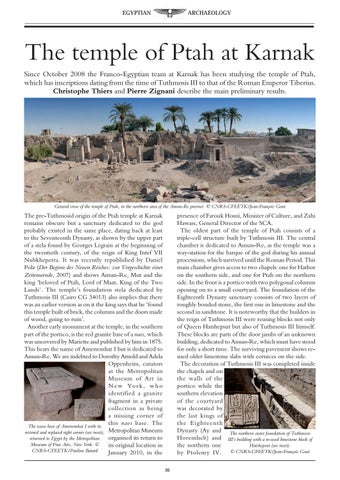 The temple of Ptah at Karnak Since October 2008 the Franco-Egyptian team at Karnak has been studying the temple of Ptah, which has inscriptions dating from the time of Tuthmosis III to that of the Roman Emperor Tiberius. Christophe Thiers and Pierre Zignani describe the main preliminary results.