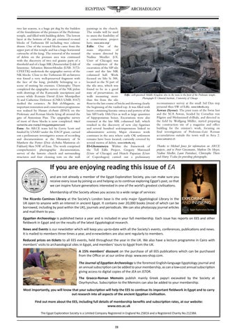 If you are enjoying reading this issue of EA and are not already a member of the Egypt Exploration Society, you can make sure you receive every issue by joining us and helping us to continue exploring Egypt’s past, so that we can inspire future generations interested in one of the world’s greatest civilisations. Membership of the Society allows you access to a wide range of services: The Ricardo Caminos Library at the Society’s London base is the only major Egyptological Library in the UK open to anyone with an interest in ancient Egypt. It contains over 20,000 books (most of which can be borrowed, including by post within the UK), journals and periodicals. We can also photocopy journal articles and mail them to you. Egyptian Archaeology is published twice a year and is included in your full membership. Each issue has reports on EES and other fieldwork in Egypt and on the results of the latest Egyptological research. News and Events is our newsletter which will keep you up-to-date with all the Society’s events, conferences, publications and news. It is mailed to members three times a year, and e-newsletters are also sent regularly to members. Reduced prices on tickets to all EES events, held throughout the year in the UK. We also have a lecture programme in Cairo with members’ visits to archaeological sites in Egypt, and members’ tours to Egypt from the UK. A 15% members’ discount on the purchase of all EES publications which can be purchased from the Office or at our online shop: www.ees-shop.com. The Journal of Egyptian Archaeology is the foremost English-language Egyptology journal and an annual subscription can be added to your membership, as can a low-cost annual subscription giving access to digital copies of the JEA on JSTOR. The Graeco-Roman Memoirs publish mainly Greek papyri excavated by the Society at Oxyrhynchus. Subscription to the Memoirs can also be added to your membership. Most importantly, you will know that your subscription will help the EES to continue its important fieldwork in Egypt and to carry out research into all aspects of the ancient Egyptian civilisation. Find out more about the EES, including full details of membership benefits and subscription rates, at our website: www.ees.ac.uk The Egypt Exploration Society is a Limited Company Registered in England No.25816 and a Registered Charity No.212384.