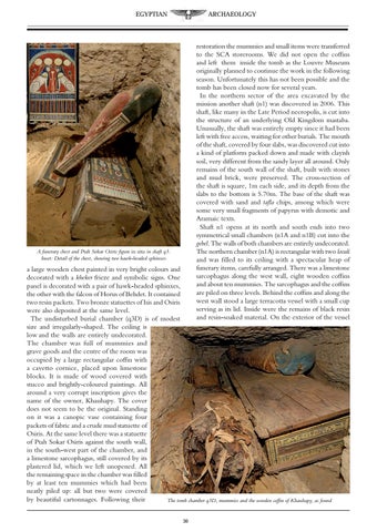 a large wooden chest painted in very bright colours and decorated with a kheker frieze and symbolic signs. One panel is decorated with a pair of hawk-headed sphinxes, the other with the falcon of Horus of Behdet. It contained two resin packets. Two bronze statuettes of Isis and Osiris were also deposited at the same level. The undisturbed burial chamber (q3D) is of modest size and irregularly-shaped. The ceiling is low and the walls are entirely undecorated. The chamber was full of mummies and grave goods and the centre of the room was occupied by a large rectangular coffin with a cavetto cornice, placed upon limestone blocks. It is made of wood covered with stucco and brightly-coloured paintings. All around a very corrupt inscription gives the name of the owner, Khauhapy. The cover does not seem to be the original. Standing on it was a canopic vase containing four packets of fabric and a crude mud statuette of Osiris. At the same level there was a statuette of Ptah Sokar Osiris against the south wall, in the south-west part of the chamber, and a limestone sarcophagus, still covered by its plastered lid, which we left unopened. All the remaining space in the chamber was filled by at least ten mummies which had been neatly piled up: all but two were covered by beautiful cartonnages. Following their The tomb chamber q3D, mummies and the wooden coffin of Khauhapy, as found 30