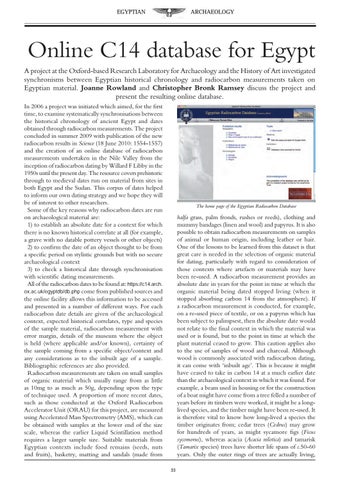 Online C14 database for Egypt A project at the Oxford-based Research Laboratory for Archaeology and the History of Art investigated synchronisms between Egyptian historical chronology and radiocarbon measurements taken on Egyptian material. Joanne Rowland and Christopher Bronk Ramsey discuss the project and present the resulting online database. In 2006 a project was initiated which aimed, for the first time, to examine systematically synchronisations between the historical chronology of ancient Egypt and dates obtained through radiocarbon measurements. The project concluded in summer 2009 with publication of the new radiocarbon results in Science (18 June 2010: 1554-1557) and the creation of an online database of radiocarbon measurements undertaken in the Nile Valley from the inception of radiocarbon dating by Willard F Libby in the 1950s until the present day. The resource covers prehistoric through to medieval dates run on material from sites in both Egypt and the Sudan. This corpus of dates helped to inform our own dating strategy and we hope they will be of interest to other researchers. Some of the key reasons why radiocarbon dates are run on archaeological material are: 1) to establish an absolute date for a context for which there is no known historical correlate at all (for example, a grave with no datable pottery vessels or other objects) 2) to confirm the date of an object thought to be from a specific period on stylistic grounds but with no secure archaeological context 3) to check a historical date through synchronisation with scientific dating measurements. All of the radiocarbon dates to be found at: https://c14.arch. ox.ac.uk/egyptdb/db.php come from published sources and the online facility allows this information to be accessed and presented in a number of different ways. For each radiocarbon date details are given of the archaeological context, expected historical correlates, type and species of the sample material, radiocarbon measurement with error margin, details of the museum where the object is held (where applicable and/or known), certainty of the sample coming from a specific object/context and any considerations as to the inbuilt age of a sample. Bibliographic references are also provided. Radiocarbon measurements are taken on small samples of organic material which usually range from as little as 10mg to as much as 50g, depending upon the type of technique used. A proportion of more recent dates, such as those conducted at the Oxford Radiocarbon Accelerator Unit (ORAU) for this project, are measured using Accelerated Mass Spectrometry (AMS), which can be obtained with samples at the lower end of the size scale, whereas the earlier Liquid Scintillation method requires a larger sample size. Suitable materials from Egyptian contexts include food remains (seeds, nuts and fruits), basketry, matting and sandals (made from