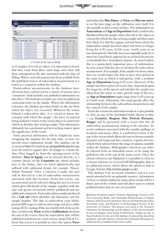 and within this Plot Dates, or View and Plot on curve, to see the date range on the calibration curve itself. It is also possible to plot a series of dates. The information on Association and Age at Deposition firstly confirms the likelihood that the sample relates directly to the object or context for which the date is being sought and then states how likely it is that the organic material from which the radiocarbon sample has been taken had been no longer living for 0-20 years, 0-100 years, 0-n00 years or an uncertain period, when the item was originally made, be it straw for a mud brick, papyrus for an archival document, or foodstuffs for a foundation deposit. As noted earlier, this is a particularly important piece of information, because it may help the user to interpret the radiocarbon measurement. For example, if the sample was from a fruit, then we would expect the fruit to have been picked in the same year in which it had grown, with a resultant Age at Deposition being 0-20 years. However, if the sample was from a piece of wood, then, dependent upon the longevity of the species and whether the sample was taken from the inner or outer growth rings of the tree, an Age at Deposition might range from 0-20 years up to 0-n00 years. Ultimately, this could greatly affect the relationship between the radiocarbon measurement and the context of the sample. From the screens for individual results it is also possible to click on any of the hot-linked fields (shown in blue - e.g. Country, Region, Site, Period, Dynasty, Reign) and be presented with a screen that lists all radiocarbon measurements relating to the selection. To avoid confusion associated with the variable spellings of locations and names, there is a pull-down menu at the top of the screen which allows the user to browse periods, dynasties and reigns and also countries, regions and sites, which when selected show the range of options available within the database. Bibliographic references can either be selected from an individual screen or by using the pull-down tab at the top of the main screen. Once the chosen references are displayed, it is possible to click on a chosen reference to received full bibliographic data in an additional screen, which allows the option to link to Google Scholar (http://scholar.google.co.uk/). This database is by no means exhaustive and it is very much intended to be an updatable resource. Information on how to submit additional radiocarbon results will be a future part of the website and will allow users to submit published dates that are not yet included.