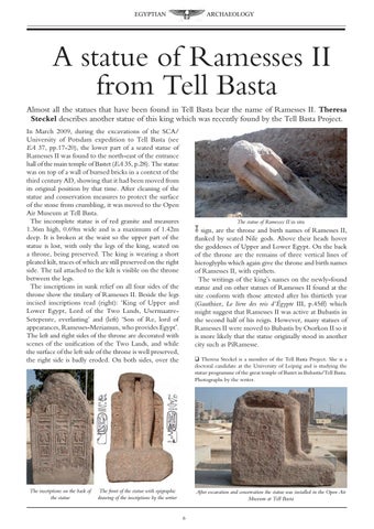 sign, are the throne and birth names of Ramesses II, flanked by seated Nile gods. Above their heads hover the goddesses of Upper and Lower Egypt. On the back of the throne are the remains of three vertical lines of hieroglyphs which again give the throne and birth names of Ramesses II, with epithets. The writings of the king’s names on the newly-found statue and on other statues of Ramesses II found at the site conform with those attested after his thirtieth year (Gauthier, Le livre des rois d’Égypte III, p.45ff) which might suggest that Ramesses II was active at Bubastis in the second half of his reign. However, many statues of Ramesses II were moved to Bubastis by Osorkon II so it is more likely that the statue originally stood in another city such as PiRamesse. q Theresa Steckel is a member of the Tell Basta Project. She is a doctoral candidate at the University of Leipzig and is studying the statue programme of the great temple of Bastet in Bubastis/Tell Basta. Photographs by the writer.