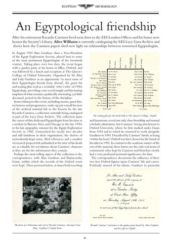 An Egyptological friendship After his retirement Ricardo Caminos lived next door to the EES London Offices and his home now houses the Society’s Library. Alice Williams is currently cataloguing the EES Lucy Gura Archive and shows how the Caminos papers shed new light on relationships between renowned Egyptologists. In August 1954 Alan Gardiner, then a Vice-President of the Egypt Exploration Society, played host to some of the most prominent Egyptologists of the twentieth century. Taking place over two days, the event began with a garden party at his home in Iffley, Oxford, and was followed by a lunch and reception at The Queen’s College of Oxford University. Organised by Sir Alan and Lady Gardiner as an opportunity ‘to meet some of their Egyptologist friends from abroad’, the guest list and seating plan read as a veritable ‘who’s who’ of 1950s Egyptology, providing a rare social insight and fascinating snapshot of what remains a politically interesting, yet little discussed, period in the history of the discipline. Items relating to this event, including menus, guest lists, invitations and programmes, make up just a small fraction of the archival material left to the Society by the late Ricardo Caminos, a collection currently being catalogued as part of the Lucy Gura Archive. The collection spans the career of this dedicated Egyptologist from his time as a student in Buenos Aires and Chicago in the late 1930s to his last epigraphic mission for the Egypt Exploration Society in 1982. Untouched for nearly two decades and still fastidious in their organisation, the shelves of meticulously-kept notes, filed references and a number of research projects left unfinished at the time of his death are as valuable for revelations about Caminos’ character as they are for the information they contain. Perhaps the most telling aspect of the collection is the correspondence with Alan Gardiner and Battiscombe Gunn, within which the records of the Oxford event were kept. These personal letters, at times both touching