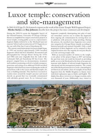 Luxor temple: conservation and site-management In 2003 EA 22 (pp.21-24) featured a report on the work of the Luxor Temple Wall Fragment Project. Hiroko Kariya and Ray Johnson describe how the project has since continued and developed. During the 2009-10 season the Epigraphic Survey of the Oriental Institute, University of Chicago (Chicago House) accomplished two major conservation projects at Luxor temple; creating public access to a representative fragment display (referred to as the ‘blockyard open-air museum’ below) and reconstruction of 111 fragments on the east wall of the Sun Court of Amenhotep III. The current conservation project in Luxor temple began in 1995 and involved approximately 2,000 inscribed fragments which had been identified, documented and photographed by Chicago House during the 1970s and 1980s and came originally from the walls of the Colonnade Hall and Amenhotep III Sun Court. The project’s original focus on documentation, treatment and condition monitoring evolved to include emergency protection and sorting of an additional 50,000 inscribed fragments which had been removed during the medieval period from walls at the Luxor and Karnak temples, for reuse as building materials. They had been excavated in modern times around the temple’s precinct and stored directly on ground that was eventually contaminated with salt-laden ground water. As we witnessed some