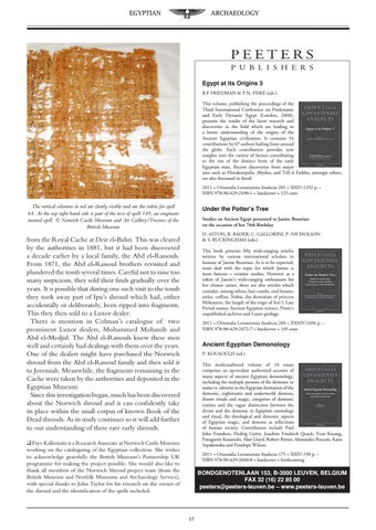 Ancient Egyptian Demonology P. kOUSOULIS (ed.) This multi-authored volume of 10 essays comprises an up-to-date authorized account of many aspects of ancient Egyptian demonology, including the multiple persona of the demonic or name vs. identity in the Egyptian formation of the demonic, nightmares and underworld demons, dream rituals and magic, categories of demonic entities and the vague distinction between the divine and the demonic in Egyptian cosmology and ritual, the theological and demonic aspects of Egyptian magic, and demons as reflections of human society. Contributors include Paul John Frandsen, Hedvig Györy, Joachim Friedrich Quack, Yvan koenig, Panagiotis kousoulis, alan Lloyd, Robert Ritner, alessandro Roccati, kasia Szpakowska and Penelope Wilson. 2011 – Orientalia Lovaniensia analecta 175 – XXIV-198 p. ISBn 978-90-429-2040-8 – hardcover – forthcoming