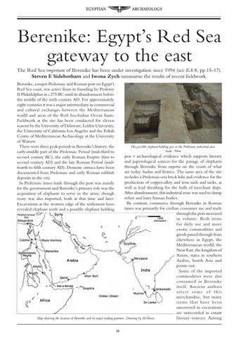 Berenike: Egypt’s Red Sea gateway to the east The Red Sea emporium of Berenike has been under investigation since 1994 (see EA 8, pp.15-17). Steven E Sidebotham and Iwona Zych summarise the results of recent fieldwork. Berenike, a major Ptolemaic and Roman port on Egypt’s Red Sea coast, was active from its founding by Ptolemy II Philadelphus in c.275 BC until its abandonment before the middle of the sixth century AD. For approximately eight centuries it was a major intermediary in commercial and cultural exchanges between the Mediterranean world and areas of the Red Sea-Indian Ocean basin. Fieldwork at the site has been conducted for eleven seasons by the University of Delaware, Leiden University, the University of California Los Angeles and the Polish Centre of Mediterranean Archaeology at the University of Warsaw. There were three peak periods in Berenike’s history: the early-middle part of the Ptolemaic Period (mid-third to second century BC), the early Roman Empire (first to second century AD) and the late Roman Period (midfourth to fifth century AD). Demotic ostraca have been documented from Ptolemaic and early Roman rubbish deposits in the city. In Ptolemaic times trade through the port was mainly for the government and Berenike’s primary role was the acquisition of elephants to serve in the army, though ivory was also imported, both at that time and later. Excavations at the western edge of the settlement have revealed elephant teeth and a possible elephant holding