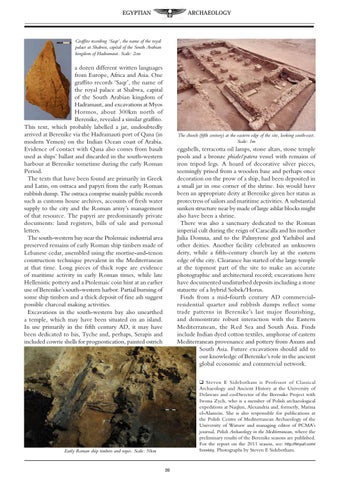 eggshells, terracotta oil lamps, stone altars, stone temple pools and a bronze phiale/patera vessel with remains of iron tripod legs. A hoard of decorative silver pieces, seemingly prised from a wooden base and perhaps once decoration on the prow of a ship, had been deposited in a small jar in one corner of the shrine. Isis would have been an appropriate deity at Berenike given her status as protectress of sailors and maritime activities. A substantial sunken structure near by made of large ashlar blocks might also have been a shrine. There was also a sanctuary dedicated to the Roman imperial cult during the reign of Caracalla and his mother Julia Domna, and to the Palmyrene god Yarhibol and other deities. Another facility celebrated an unknown deity, while a fifth-century church lay at the eastern edge of the city. Clearance has started of the large temple at the topmost part of the site to make an accurate photographic and architectural record; excavations here have documented undisturbed deposits including a stone statuette of a hybrid Sobek/Horus. Finds from a mid-fourth century AD commercialresidential quarter and rubbish dumps reflect some trade patterns in Berenike’s last major flourishing, and demonstrate robust interaction with the Eastern Mediterranean, the Red Sea and South Asia. Finds include Indian dyed cotton textiles, amphorae of eastern Mediterranean provenance and pottery from Axum and South Asia. Future excavations should add to our knowledge of Berenike’s role in the ancient global economic and commercial network. q Steven E Sidebotham is Professor of Classical Archaeology and Ancient History at the University of Delaware and co-Director of the Berenike Project with Iwona Zych, who is a member of Polish archaeological expeditions at Naqlun, Alexandria and, formerly, Marina el-Alamein. She is also responsible for publications at the Polish Centre of Mediterranean Archaeology of the University of Warsaw and managing editor of PCMA’s journal, Polish Archaeology in the Mediterranean, where the preliminary results of the Berenike seasons are published. For the report on the 2011 season, see: http://tinyurl.com/ 5vxx66y. Photographs by Steven E Sidebotham.