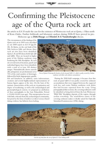 Confirming the Pleistocene age of the Qurta rock art An article in EA 33 made the case for the existence of Pleistocene rock art at Qurta, c.15km north of Kom Ombo. Further fieldwork and laboratory analyses during 2008-09 have proved its preHolocene age as Dirk Huyge and Dimitri A G Vandenberghe discuss. The circumstances of the finding of the Qurta rock art in 2005 were described in our 2008 report in EA 33 (pp.2528). At Qurta, on the east bank of the Nile between Edfu and Aswan, three rock art sites have been identified: Qurta I, II and III (henceforth QI, QII and QIII). They are located in higher parts of the Nubian sandstone scarp bordering the Nile floodplain. At each site several rock art locations, panels and individual figures have been identified, with a total of at least 185 distinct images. Naturalistically drawn aurochs (Bos primigenius) are predominant (over View of Qurta II showing the location of rock art panel QII.4.2, which is partly covered by Nubian 75% of the total number of drawings), sandstone rock debris and sediment accumulations followed by birds, hippopotami, gazelle, During the 2008 field campaign, it became clear that fish and hartebeest. In addition, some indeterminate rock art panel QII.4.2 was partly covered by sediment creatures and several highly-stylized representations of accumulations that were trapped between the engraved human figures appear at the sites. On the basis of the rock face and coarse Nubian sandstone rock debris intrinsic characteristics of the rock art, its patination and that had become separated from the scarp. Using degree of weathering, as well as the archaeological and petrographical thin sections, the covering sediment could geomorphological context, we proposed an attribution be identified as being derived from the Late Pleistocene of these petroglyphs to the Late Palaeolithic Period ‘Wild Nile’ floodplain deposits of the region, through (c.19,000-18,000 years ago). This interpretation has met aeolian reworking. The wind-blown nature of the with little criticism from the archaeological community, covering sediment makes it ideally suited for Optically but proof in the form of indirect or direct science-based Stimulated Luminescence (OSL) dating. dating evidence has hitherto been lacking.