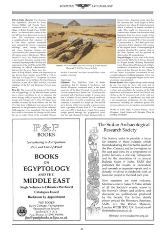 historic times. Augerings made clear that the causeway has a total length of 140m and opens into a huge U-shaped structure which is defined by massive mud-brick walls. This might be interpreted as a harbour basin. Several new limestone relief fragments from the lower temple of the Bent Pyramid were uncovered. Four MK shafts were excavated W of the pyramid of Amenemhat II. One shaft opens into a limestone burial chamber with remains of the original burial. Geomorphological mapping identified five quarries close to the Bent Pyramid and the pyramid of Amenemhat III. www.dainst.org Nag el-Hagar: A joint team of the Swiss Inst and the MSA/SCA Aswan, directed by Regina Franke (Ludwig Maximilian Univ, Munich) and Mohammed el-Bialy, conducted excavations in the severelydestroyed late Roman fortress 18km S of Kom Ombo. Excavation concentrated on the central headquarter building (principia), where the foundations of an octogonally-shaped room were uncovered. www.swissinst.ch Aswan South: After urgent salvage works during the last two years the Swiss Inst team, led by Cornelius von Pilgrim, has started a new project to clean and consolidate the remains of the MK fortification wall between Aswan and Shellal and c.200m at the N preserved end of the wall was cleaned this season. A guardhouse was built and a site-management programme for this unique monument, including an exhibition ground for rock inscriptions, is in preparation. www.swissinst.ch Thanks to Colin Hope, Gianluca Miniaci, Nicole Alexanian, Angelo Sesana and Christophe Thiers for providing photographs.