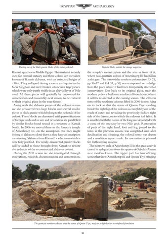 Hatnub quarries in Middle Egypt. This material is rarely used for colossal statuary and these colossi are the tallest known of Hatnub alabaster, with an estimated height of c.18m. They collapsed during a severe earthquake in the New Kingdom and were broken into several large pieces, which were only partly visible in an alluvial layer of Nile mud. All these pieces will gradually be uncovered for conservation and reassembly next season, to be restored to their original place in the near future. Along with the alabaster pieces of the colossal statues we also recovered two large blocks and several smaller pieces in black granite which belong to the pedestals of the colossi. These blocks are decorated with personifications of foreign lands and in size and decoration are parallelled by similar blocks found reused in a structure at Karnak South. In 2006 we moved these to the funerary temple of Amenhotep III, on the assumption that they might belong to alabaster colossi there as they have an inscription mentioning ‘alabaster from Hatnub’ - a decision which is now fully justified. The newly-discovered granite blocks will be added to those brought from Karnak to restore the pedestals of the reconstructed alabaster colossi. During the 2011 season we also investigated, through excavations, research, documentation and conservation,