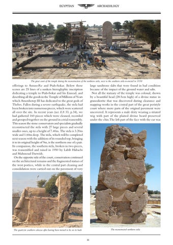offerings to Amun-Re and Ptah-Sokar. Below these scenes are 25 lines of a sunken hieroglyphic inscription dedicating a temple to Ptah-Sokar and his Ennead, and describing all the goods in the Temple of Millions of Years which Amenhotep III has dedicated to the great gods of Thebes. Fallen during a severe earthquake, the stela had been broken into numerous pieces, which were scattered all over the site. In recent years (see EA 33, p.34), we had gathered 160 pieces which were cleaned, recorded and grouped together on the ground in a trial reassembly. This season the stone conservators and specialists gradually reconstructed the stela with 27 large pieces and several smaller ones, up to a height of 7.40m. The stela is 3.20m wide and 1.60m deep. The stela, which will be completed next season with the addition of its rounded top, bringing it to its original height of 9m, is the northern one of a pair. Its companion, the southern stela, broken in two pieces, was reassembled and raised in 1950 by Labib Habachi and Mahmoud Darwish. On the opposite side of the court, conservation continued on the architectural remains and the fragmented statues of the west portico, while in the central part cleaning and consolidation were carried out on the pavement of very