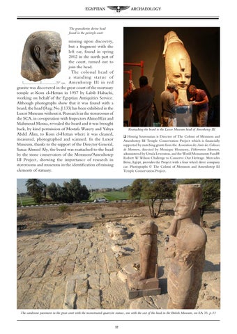 missing upon discovery, but a fragment with the left ear, found in spring 2002 in the north part of the court, turned out to join the head. The colossal head of a standing statue of Amenhotep III in red granite was discovered in the great court of the mortuary temple at Kom el-Hettan in 1957 by Labib Habachi, working on behalf of the Egyptian Antiquities Service. Although photographs show that it was found with a beard, the head (Reg. No. J.133) has been exhibited in the Luxor Museum without it. Research in the storerooms of the SCA, in co-operation with Inspectors Ahmed Ezz and Mahmoud Mousa, revealed the beard and it was brought back, by kind permission of Mostafa Wazery and Yahya Abdel Alim, to Kom el-Hettan where it was cleaned, measured, photographed and scanned. In the Luxor Museum, thanks to the support of the Director General, Sanaa Ahmed Aly, the beard was reattached to the head by the stone conservators of the Memnon/Amenhotep III Project, showing the importance of research in storerooms and museums in the identification of missing elements of statuary.