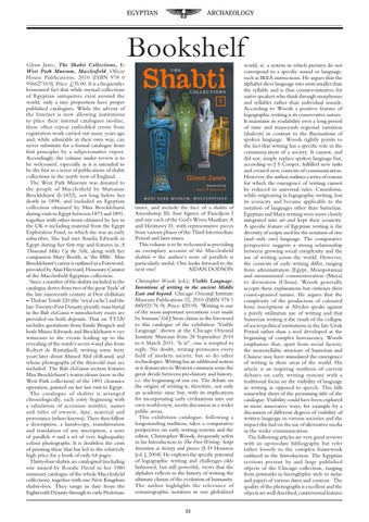 Glenn Janes, The Shabti Collections, 1: West Park Museum, Macclesfield. Olicar House Publications, 2010 (ISBN 978 0 95662710 0). Price: £35.00. It is a frequentlybemoaned fact that while myriad collections of Egyptian antiquities exist around the world, only a tiny proportion have proper published catalogues. While the advent of the Internet is now allowing institutions to place their internal catalogues on-line, these often repeat embedded errors from registration work carried out many years ago and, while admirable in their own way, can never substitute for a formal catalogue from first principles by a subject-matter expert. Accordingly, the volume under review is to be welcomed, especially as it is intended to be the first in a series of publications of shabti collections in the north west of England. The West Park Museum was donated to the people of Macclesfield by Marianne Brocklehurst (b.1832), not long before her death in 1898, and included an Egyptian collection obtained by Miss Brocklehurst during visits to Egypt between 1873 and 1891, together with other items obtained by her in the UK – including material from the Egypt Exploration Fund, to which she was an early subscriber. She had met Amelia Edwards in Egypt during her first trip and features in A Thousand Miles Up the Nile, along with her companion Mary Booth, as ‘the MBs’. Miss Brocklehurst’s career is outlined in a Foreword, provided by Alan Hayward, Honorary Curator of the Macclesfield Egyptian collection. Since a number of the shabtis included in the catalogue derive from two of the great ‘finds’ of the late nineteenth century at Deir el-Bahari – Theban Tomb 320 (the ‘royal cache’) and the late Twenty-First Dynasty priestly mass burial in the Bab el-Gasus – introductory essays are provided on both deposits. That on TT320 includes quotations from Emile Brugsch and both Misses Edwards and Brocklehurst – eye witnesses to the events leading up to the revealing of the tomb’s secret – and also from Robert de Rustafjaell, writing some forty years later about Ahmed Abd el-Rassul, and whose photographs of the then-old man are included. The Bab el-Gasus section features Miss Brocklehurst’s watercolours (now in the West Park collection) of the 1891 clearance operation, painted on her last visit to Egypt. The catalogue of shabtis is arranged chronologically, each entry beginning with a tabulation of accession number, names and titles of owners, date, material and provenance (where known). There then follow a description, a hand-copy, transliteration and translation of any inscription, a note of parallels – and a set of very high-quality colour photographs. It is doubtless the costs of printing these that has led to the relatively high price for a book of only 64 pages. Thirty-four shabtis are catalogued (including one missed by Rosalie David in her 1980 summary catalogue of the whole Macclesfield collection), together with one New Kingdom shabti-box. They range in date from the Eighteenth Dynasty through to early Ptolemaic