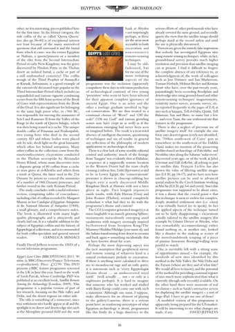 other, no less interesting, pieces published here for the first time. In the former category, the rishi coffin of the so called ‘Qurna Queen’ (see also pp.38-40) is of exceptional interest not least because of the many unresolved questions that still surround it and the burial from which it came: was the owner Egyptian or Nubian, a queen/princess or a member of the elite from the Second Intermediate Period or early New Kingdom; was the grave discovered by Flinders Petrie in the Theban desert an isolated burial, a cache or part of a still undisturbed cemetery? The coffin trough of the Third Prophet of Amun-Re at Karnak, Iufenamun, is a good example of the extensively decorated type popular in the Third Intermediate Period which includes an unparalleled and curious vignette combining scenes from the fifth hour section of the Book of Gates with representations from the Book of the Dead. It is also significant for belonging to the same high priest who, in c.960 BC, was responsible for moving the mummies of Seti I and Ramesses II from the Valley of the Kings to the tomb of Queen Inhapy, which was then being reused as a cache. The unique double coffin of Petamun and Penhorpabik, two young boys who died in the second century AD and whose bodies were placed side by side, sheds light on the great humanity which often lies behind antiquities. Many other coffins in the collection come from the nineteenth-century excavations conducted in the Theban necropolis by Alexander Henry Rhind, whose main discoveries were a disparate group of 80 coffins from a cache or mass grave at el-Khokha and others from a tomb at Qurna, the latter used in the 21st Dynasty by priests to conceal the mummies of a number of 18th Dynasty princesses, and further reused in the early Roman Period. The study concludes with a useful reference section, comprising tables of concordance, including a list of coffins recorded by Margaret Murray in her Catalogue of Egyptian Antiquities in the National Museum of Antiquities (1900), a small glossary, and a comprehensive index. The book is illustrated with many highquality photographs and is attractively and clearly laid out. It is a valuable addition to the subject of Egyptian coffins and the history of Egyptological collections, and is recommended for both coffin specialists and general interest readers. GIANLUCA MINIACI Finally David Jeffreys reviews the DVD of a recent television programme. Egypt’s Lost Cities (BBCDVD3361) 2011. 90 mins (a BBC/Discovery/France Televisions co-production). Price: £12.99. This DVD presents a BBC feature programme screened in the UK in June this year, based on the work of Sarah Parcak, whose Cambridge PhD was published as an excellent book, Satellite Remote Sensing for Archaeology (London, 2009). This programme is a popular version of part of her research, focusing on the Nile valley and Delta, and the desert regions on either side. The title is something of a misnomer, since true settlement sites hardly appear at all and the spotlight is on desert and desert-edge sites such as the Memphite pyramid field and the west