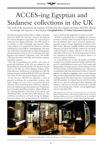The work of the Association for Curators of Collections from Egypt and Sudan (ACCES), sharing knowledge and expertise, is described by Campbell Price and Gina Criscenzo-Laycock. receive feedback and suggestions for future activities. ACCES is particularly keen to highlight the existence of archive material, and to encourage its use by members. Recent initiatives have raised awareness among nonspecialist curators of major Egyptological archives at the EES, Petrie Museum, Griffith Institute and Garstang Museum, Liverpool. ACCES also continues to encourage archival research in smaller collections as this can be an especially useful resource for presenting narratives about the acquisition of objects by local figures, which is of interest to regional audiences. A recent priority was to raise the profile of ACCES among its own members and more broadly, and Facebook proved a useful platform to post news, share images and discuss topics of mutual interest. Redevelopment of the ACCES website included uploading more information on individual collections and resources, links to Facebook galleries of collection highlights, and a search function linked to the CultureGrid (formerly Cornucopia) website, enabling searches (by object type, site, or excavator) of all ACCES members. It is hoped that the ACCES website will act as a hub for information about Egyptian and Sudanese collections in the UK, and provide a valuable means of increasing their visibility among Egyptologists and non-specialists alike.