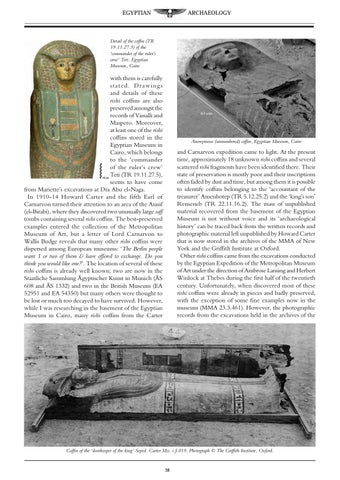 and Carnarvon expedition came to light. At the present time, approximately 18 unknown rishi coffins and several scattered rishi fragments have been identified there. Their state of preservation is mostly poor and their inscriptions often faded by dust and time, but among them it is possible to identify coffins belonging to the ‘accountant of the treasurer’ Amenhotep (TR 5.12.25.2) and the ‘king’s son’ Renseneb (TR 22.11.16.2). The mass of unpublished material recovered from the basement of the Egyptian Museum is not without voice and its ‘archaeological history’ can be traced back from the written records and photographic material left unpublished by Howard Carter that is now stored in the archives of the MMA of New York and the Griffith Institute at Oxford. Other rishi coffins came from the excavations conducted by the Egyptian Expedition of the Metropolitan Museum of Art under the direction of Ambrose Lansing and Herbert Winlock at Thebes during the first half of the twentieth century. Unfortunately, when discovered most of these rishi coffins were already in pieces and badly preserved, with the exception of some fine examples now in the museum (MMA 23.3.461). However, the photographic records from the excavations held in the archives of the