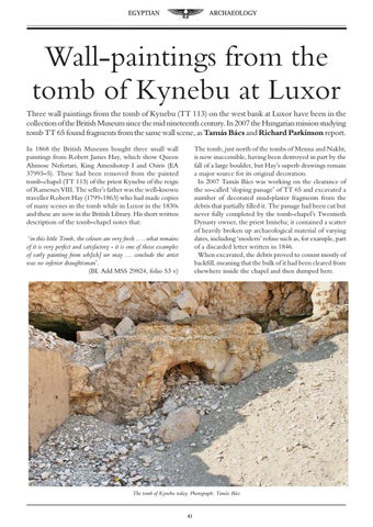 Wall-paintings from the tomb of Kynebu at Luxor Three wall paintings from the tomb of Kynebu (TT 113) on the west bank at Luxor have been in the collection of the British Museum since the mid nineteenth century. In 2007 the Hungarian mission studying tomb TT 65 found fragments from the same wall scene, as Tamás Bács and Richard Parkinson report. In 1868 the British Museum bought three small wall paintings from Robert James Hay, which show Queen Ahmose Nefertari, King Amenhotep I and Osiris (EA 37993–5). These had been removed from the painted tomb-chapel (TT 113) of the priest Kynebu of the reign of Ramesses VIII. The seller’s father was the well-known traveller Robert Hay (1799-1863) who had made copies of many scenes in the tomb while in Luxor in the 1830s and these are now in the British Library. His short written description of the tomb-chapel notes that: