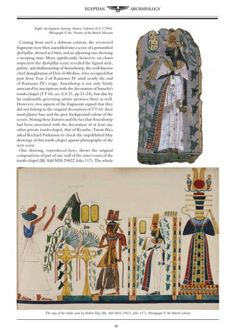 Coming from such a dubious context, the recovered fragments were then assembled into a scene of a personified djed-pillar, dressed as Osiris, and an adjoining one showing a weeping man. More significantly, however, on closer inspection the djed-pillar scene revealed the figural style, palette, and draftsmanship of Amenhotep, the well-known chief draughtsman of Deir el-Medina, who occupied that post from Year 2 of Ramesses IV until nearly the end of Ramesses IX’s reign. Amenhotep is not only firmly associated by inscriptions with the decoration of Imiseba’s tomb-chapel (TT 65, see EA 21, pp.21-24), but also by his undeniable governing artistic presence there as well. However, two aspects of the fragments argued that they did not belong to the original decoration of TT 65: their mud-plaster base and the grey background colour of the scenes. Noting these features and the fact that Amenhotep had been associated with the decoration of at least one other private tomb-chapel, that of Kynebu, Tamás Bács asked Richard Parkinson to check the unpublished Hay drawings of this tomb-chapel against photographs of the new scene. One drawing, reproduced here, shows the original compositions of part of one wall of the outer room of the tomb-chapel (BL Add MSS 29822, folio 117). The whole