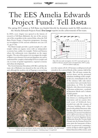 The EES Amelia Edwards Project Fund: Tell Basta The spring 2011 season at Tell Basta was funded directly by donations made by EES members to the Amelia Edwards Projects Fund. Eva Lange reports on the achievements of her team. In 2008 a new chapter was opened in the history of research at Tell Basta (Bubastis), the site of the ancient city of the cat goddess in the eastern Delta, when the Tell Basta Project began a long-term programme, focusing on investigation of the ancient settlement area (see EA 37, pp.17-18). The Bastet temple provides a good example of a culttemple within an organic town with an independent economic base, unlike, for example, Thebes and Amarna where the settlements were dependent on the major temples. The aim of the project is to investigate the temple of Bastet as an element of an ancient Egyptian city and to understand the complex relationship between temple and city in terms of spatial organisation, regional economy and urban development. The Greek historian Herodotus (450 BC) said that the main city of Bubastis was situated on the east of the site and, although the modern city of Zagazig is encroaching