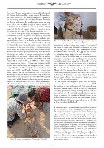 excavations, and also with a diverse range of ceramics of various types, dates and fabrics located during previous seasons at Quesna, including early Old Kingdom material from the mastaba tomb (see EA 38, pp.10-13), as well as ceramics from other locations within Minufiyeh. Since the aim of the field school was to train students in excavation techniques and recording, it was crucial that most of the instruction was given in the field. However, every Saturday formal lectures were held in Shibin elKom, thanks to our collaboration with Ahmed Deraz, Head of the Faculty of Archaeology at the University of Minufiyeh. The lectures focused upon the key elements of instruction from the previous week and concluded with a short test. At the end of the field school, there was a formal exam, which, I am pleased to report, was passed by all of the attending students. As this edition of EA goes to press, plans are already underway for the second field school in autumn 2012. In addition to basic archaeological field methodology, additional training will be offered in surveying techniques, including geophysical survey, drawing of small finds and the analysis of both plant and animal remains. We also hope to increase the number of formal lectures at the University of Minufyeh, which will enable more students from the Faculty of Archaeology to become involved in at least part of the field school. q Joanne Rowland is Director of the EES Minufiyeh Archaeological Survey and Junior Professor in Egyptian Archaeology in the Egyptology Department, Free University, Berlin. Thanks are due to the following colleagues who were instructors during the field school: Geoffrey Tassie (University of Winchester), Lawrence Owens (Birkbeck College, University of London), Ashraf el-Senussi (Kom Aushim Museum), Mandy Mamedow (Humboldt University, Berlin) and Yasser Mohammed Mahmoud el-Kolaly (SCA). The field-school was generously supported by the Deutscher Akademischer Austausch Dienst and simultaneous fieldwork at Quesna was supported by the Michela Schiff Giorgini Foundation. Thanks are due to the EES Cairo Office for logistical assistance and the loan of surveying equipment, to Florian Kohstall (Free University, Berlin, Cairo Office) for his support of the field-school project, to the SCA in Tanta and at Quesna for continued support and for the use of additional rooms during the field-school, to our inspector Sara el-Said Mohammed el-Said and to the local workforce at Quesna. Photographs © EES Minufiyeh Archaeological Survey