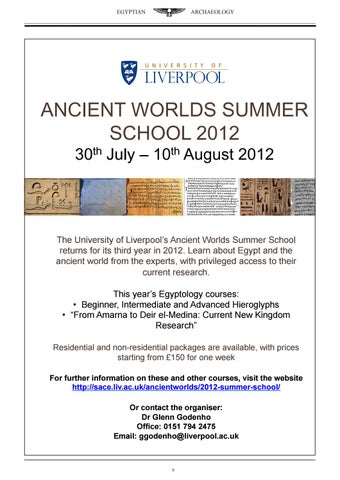The University of Liverpool’s Ancient Worlds Summer School returns for its third year in 2012. Learn about Egypt and the ancient world from the experts, with privileged access to their current research. This year’s Egyptology courses: • Beginner, Intermediate and Advanced Hieroglyphs • “From Amarna to Deir el-Medina: Current New Kingdom Research” Residential and non-residential packages are available, with prices starting from £150 for one week For further information on these and other courses, visit the website http://sace.liv.ac.uk/ancientworlds/2012-summer-school/ Or contact the organiser: Dr Glenn Godenho Office: 0151 794 2475 Email: ggodenho@liverpool.ac.uk