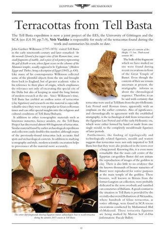 Terracottas from Tell Basta The Tell Basta expedition is now a joint project of the EES, the University of Göttingen and the SCA (see EA 39, pp.7-9), Veit Vaelske is responsible for study of the terracottas found during the work and summarises his results to date. John Gardner Wilkinson (1797-1875) visited Tell Basta in the early nineteenth century and later remarked: ‘In the mounds I found a few copper coins of late Roman time, some small fragments of marble, and a piece of red pottery representing the god of death or war, whose figure occurs on the columns of the Mammisi temples, usually supposed to be Typhonian.’ (Modern Egypt and Thebes; being a description of Egypt (1843), p.430). Like many of his contemporaries Wilkinson collected some of the plentiful objects from the site and brought them back to England, but of greater academic value is his reference to their place of origin, which emphasises the relevance not only of excavating this special city of the Delta but also of keeping in mind the long history of modern research at the site. Since Wilkinson’s time, Tell Basta has yielded an endless series of terracottas (clay figurines) and research on this material is especially valuable since they were very popular in Graeco-Roman times and can offer special insights into the religious and cultural conditions of Tell Basta/Bubastis. It addition to other iconographic materials such as limestone statuettes, faience amulets, etc. the Tell Basta Project has discovered almost 400 fragments of terracottas. Similar material found by earlier archaeological expeditions and collectors easily doubles this number, although many of the previously-found terracottas lack accurate find spots and archaeological contexts. In addition to studying iconography and style, modern scientific excavation helps to provenance all the material more accurately.