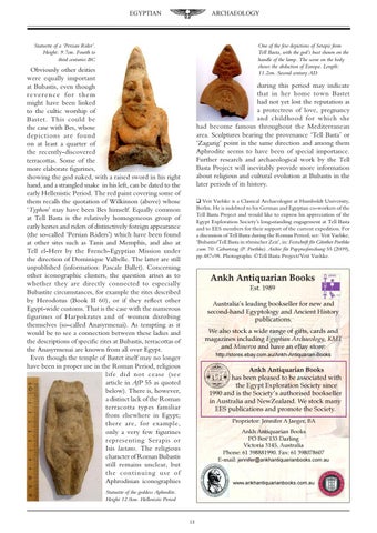 during this period may indicate that in her home town Bastet had not yet lost the reputation as a protectress of love, pregnancy and childhood for which she had become famous throughout the Mediterranean area. Sculptures bearing the provenance ‘Tell Basta’ or ‘Zagazig’ point in the same direction and among them Aphrodite seems to have been of special importance. Further research and archaeological work by the Tell Basta Project will inevitably provide more information about religious and cultural evolution at Bubastis in the later periods of its history. q Veit Vaelske is a Classical Archaeologist at Humboldt University, Berlin. He is indebted to his German and Egyptian co-workers of the Tell Basta Project and would like to express his appreciation of the Egypt Exploration Society’s long-standing engagement at Tell Basta and to EES members for their support of the current expedition. For a discussion of Tell Basta during the Roman Period, see: Veit Vaelske, ‘Bubastis/Tell Basta in römischer Zeit’, in: Festschrift für Günther Poethke zum 70. Geburtstag (P. Poethke). Archiv für Papyrusforschung 55 (2009), pp.487-98. Photographs: ©Tell Basta Project/Veit Vaelske.