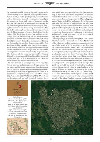 sites which seem to be entirely lost today, but with the help of these maps and satellite images they can often be relocated in the field with the aid of surface surveying, auger core drilling and magnetometry. ������������������ Many villages, or parts of them, in the Delta are built on elevated ground, indicating the existence of underlying ancient tells. Sites covered by modern constructions can be separated into partially and completely built-up tells. While in the former some open areas are still accessible for archaeological research, the latter are more challenging to investigate and subsurface work at such sites can often be achieved only with auger core drilling. The large village of Shabas Umayyir (31 06 07 N/30 47 27 E) lies about 11km south-east of Buto. ����������� North-west of the village are two large modern cemeteries situated on top of tells, which have a height of up to 5m. Together the two cemeteries cover about 2.5ha. The edges of the tells and the fields surrounding them are very rich in Roman pottery, indicating that there had formerly been a substantial ancient site here. Two maps (see below) provide clues as to when they ceased being ancient settlement mounds and started being used as cemeteries. A cadastral map from 1884 shows the tell north-west of the village, with a small pond at its southern edge. The pond was probably the result of material having been removed from the tell, either to make bricks or to be used as fertiliser. At this time the surface of the tell was free of graves but by the time of the 1913 survey map, it had been established as a burial ground and the pond was much larger – presumably directly connected to the growth of the village. At a later point the pond was filled