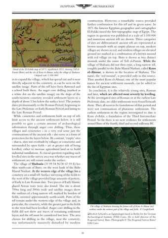 in to expand the village, which has spread out and is now directly adjacent to the cemetery, as can be seen on the satellite image. Parts of the tell have been flattened and a school built there. An auger core drilling (marked as a white dot on the satellite image) on the slope of the south-western cemetery revealed settlement layers to a depth of about 3.5m below the surface level. The pottery dates predominantly to the Roman Period, beginning in the Late Ptolemaic or Early Roman Period and lasting to the Late Roman Period. While cemeteries and settlements built on top of tells limit access to the ancient settlements below, it is still possible to gain a certain amount of archaeological information through auger core drilling. Thus, these villages and cemeteries - in a very real sense just the continuations of the ancient tells - also serve as a form of protection for the layers below. By contrast, ‘empty’ sites - that is, sites not overbuilt by villages or cemeteries and surrounded by open fields - are at greater risk of being levelled, either to increase agricultural land or to build industrial installations. A crucial question regarding such levelled sites in the survey area was whether any traces of settlements are still extant under the surface. The village of Shabasia (31 09 54 N/30 47 59 E) lies 6km south-east of Buto, on the west bank of the Bahr Masraf Nashart. At ������������������������������������������ the western edge of the village lies a cemetery on a small tell. Surface surveying of the fields to the west of the village provided large amounts of pottery, of Early to Late Roman date. Two pieces of Early Islamic glazed Aswan ware were also found. The site is about 700m long and 300m wide and satellite images show the outlines of a long narrow tell, marked by borders of fields, oriented approximately north-south. Parts of the tell remain under the western edge of the village and, in particular, the cemetery, while the greater part in the fields to the west had been levelled. Auger core drilling in the fields did not show any traces of remaining settlement layers and the tell must be considered lost here. The area chosen for drilling in the village, near the cemetery, was unfortunately massively disturbed by modern